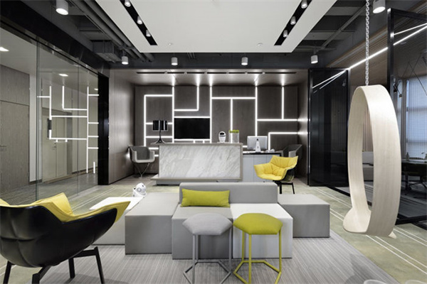 3、辦公室前臺作為辦公室裝修設(shè)計中重要的一部分,更要實現(xiàn)功能與美感的高度統(tǒng)一,旁邊可配備招待客人的小茶幾和洽談椅,為辦公室營造出一種輕松的氛圍。讓來訪者感到放松,更能促進(jìn)合作。